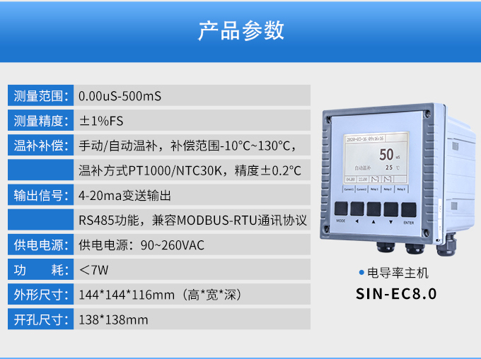SIN-EC8.0工業電導率儀表,大屏顯示,可對各種工業用水的電導率(TDS)值進行連續測量和控制。根據水工業的環境和特點結合國際供電標準,考慮了特殊環境的電氣設計規范,增加了220VAC供電。