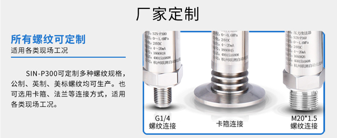 SIN-P300通用型壓力變送器德國進口硅芯片,精度高性能穩定;SIN-P300型通用型壓力變送器采用擴散硅壓力芯體作為敏感元件,內置處理電路將傳感器毫伏信號轉換成標準電壓﹑電流信號輸出,可直接與計算機、控制儀表﹑顯示儀表等相連。選用高穩定性和高可靠性的壓阻式壓力傳感器和高性能的變送器專用電路,整體性能穩定可靠,可進行遠距離信號傳輸。采用一體化全不銹鋼結構,經過多次不銹鋼焊接,實現了全固態設計,安裝方便,具有高抗振性和抗擊性,在惡劣環境中可以長期使用。廣泛應用于工業自動化設備配套以及石油、化工、冶金、電力等控制領域。